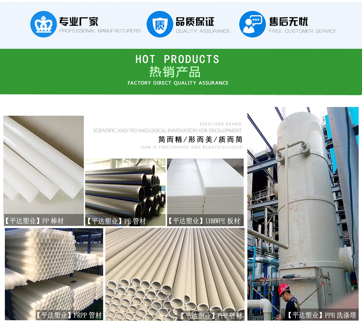 镇江平达塑料防腐管材有限公司生产企业地处素有江中明珠,水上花园城市之称的长江岛市——扬中。公司一直选用质量优异的管道专用原材料,安装了全套目前世界高新的德国巴顿菲尔挤出加工设备,建立了设备_高新的测试中心和实验室,还建立了技术安装服务部,为用户在工程设计、安装施工、管理等方面给予强有力支持。主要生产PP管材FRPP管材PPH管材PVDF管材,FRPP管,管材及管件、板材、棒材、阀门等产品,安装维修方便、工程造价低等优点,已广泛应用于给水工程、排水工程、排污工程、农田灌溉工程、腐蚀性液体输送工程、光纤电缆护套工程等领域。